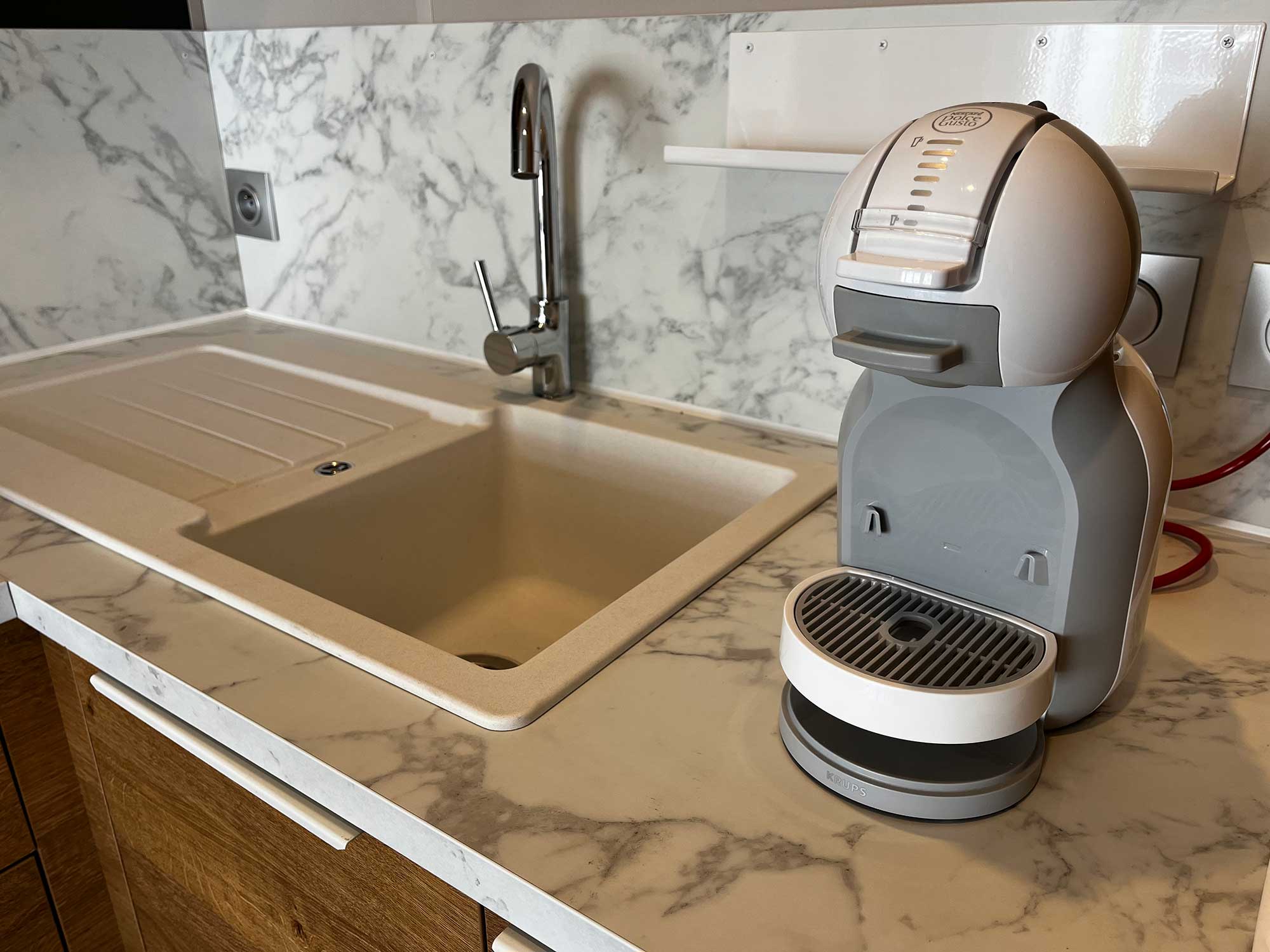 - a kitchen equipped with microwave, DOLCE GUSTO coffee maker, large fridge/freezer, gas hob, complete crockery